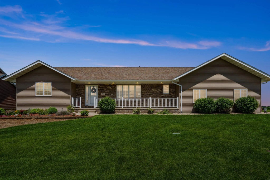 WELCOME to a home that truly has it all! Style, space, and location. Beautifully custom designed by local builder Woods Construction. This sprawling ranch style home boasts multiple living spaces and wide open layout. This home offers comfort and thoughtful design. The front entry welcomes you with attached covered sun porch for those morning coffee delights and evening sunsets. As you enter the front foyer you will be astonished on the depth of the vaulted ceilings, six panel doors, the beautiful wood flooring , and views of the contemporary open main floorplan. This gourmet dream kitchen is complete with custom oak cabinetry, stainless steel appliances, and spacious center breakfast island bar. Conveniently near the kitchen is your laundry room with oak cabinets, folding table, and half bathroom with large tub sink. The versatile sun room offers more usable space with electric fireplace and several surrounding windows as you relax and admire the beauty of nature of all seasons! The sunroom glass sliding door leads you to the fresh air of a corner lot country view of professionally designed impressive landscaping with irrigation system, retaining block walls with stone staircase to a large garden area, and stone concrete patio! There is a formal dining room with oak flooring and comfortable cozy living room area as you sit and relax and admire all of the natural lighting throughout your home. As you enter near the living area you are offered two spacious bedrooms with walk in closets and 3/4 full bathroom. The lower level is a great area for many options including designated area for a pool table, recreational, game, fitness machines, and a potential space for a cozy movie theatre with newer carpet and stubbed for a wet bar. There are two bedrooms near the family room and unique designed bathroom with jacuzzi tiled bath tub, ceramic tile flooring , walk in shower, and double vanity sinks. The three stall attached heated garage includes completely finished with drywall, epoxy painted flooring, entry composite deck leading to the side door of home, screen netting on the double garage, workshop, and entry access to the basement. There is an additional attached storage shed located under the lower level of the sunroom to store away your garden and lawn items! This home is located less than an hour to the Cedar Valley and near by interstates. Wonderful welcoming community with schools, daycares, swimming pool, hardware, grocery stores, bike trails, and restaurants. Do not miss out on the happiness, enjoyment, and freedom of owning this dream home.